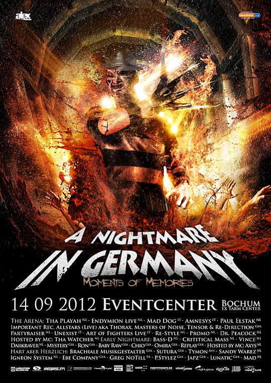 Nachdem die legendäre Partyreihe im letzen Jahr wiederbelebt wurde, geht der Veranstalter A.L.E.X. Events nun noch einen Schritt weiter und bringt Freddy am 14.09.2012 zurück an seinen Geburtsort. Das Eventcenter, das ehemalige Tarm Center in Bochum, ist und war die perfekte Location für diese Partyreihe. „Moments of Memories“ ist das passende Motto, denn dort wurden Partys gefeiert an die sich die älteren Besucher gerne zurück erinnern und die Jüngeren gerne dabei gewesen wären. Die Mainarea ist in der Zwischenzeit deutlich vergrößert worden, es wurde renoviert, aber der grundsätzliche Aufbau ist unverändert. So werden an diesem Abend in drei Areas die bekannten A.L.E.X. Events Sound- und Lichtanlagen aufgebaut. In der großen Mainarea spielen Headliner wie The Playah, Endymion, Important Records Allstars, Mad Dog, Partyraiser, Art of Fighters, Dr. Peacock und natürlich Paul Elstak, der auf keiner Nightmare in Germany fehlen darf. Der zweite Bereich hat den Titel „Early Nightmare“ und da ist der Name Programm. Bass-D, Critical Mass, Ron, Vince und Darkraver werden ihre Plattentaschen mit alten Hardcore und Early Rave Klassikern bestücken und eine Zeitreise in die 90er Jahre anführen. Die dritte Area für Industrial und Hardtechno wird von „Hart aber Herzlich“ gehostet. Brachiale Musikgestalter, Tymon, Sandy Warez und EBE Company sind die Headliner hier, aber das ist natürlich ebenfalls nicht das komplette Line Up. Insgesamt spielen 40 Acts in der Zeit von 20:00 bis 07:00 Uhr am nächsten Morgen. Sei dabei, wenn Freddy an seinen Lieblingsort zurückkehrt und werde Teil einer unvergesslichen Party.